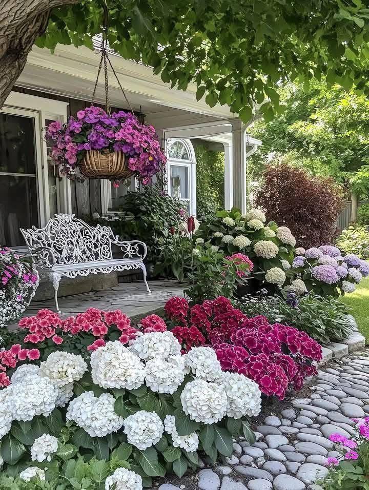 Прекрасная клумба с гортензиями у входа