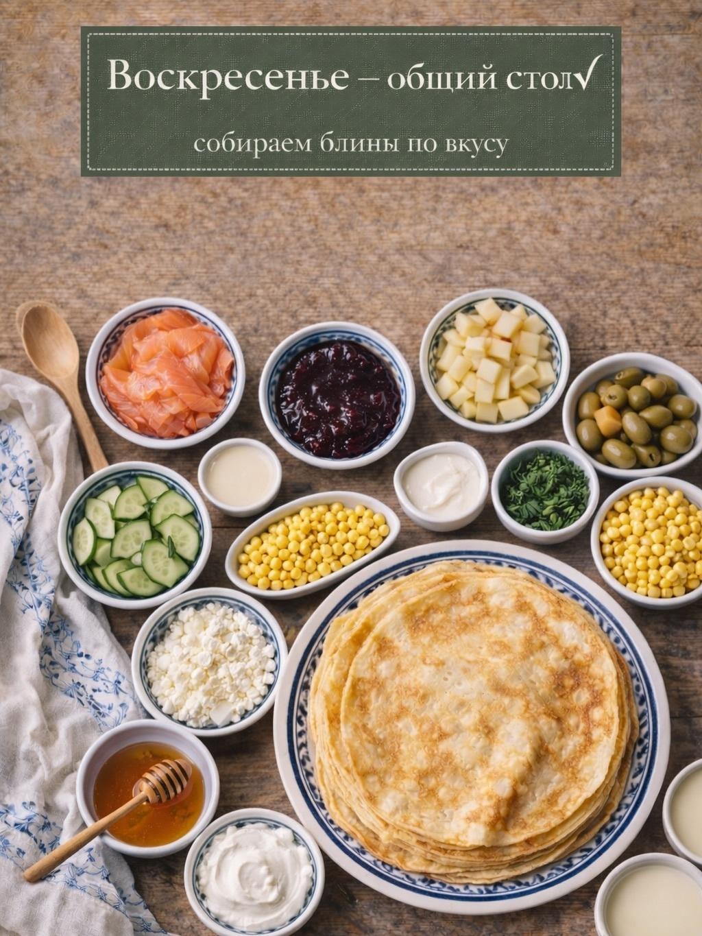 ✓ в воскресенье общий стол: блинчики, начинки и каждый собирает блин по вкусу
