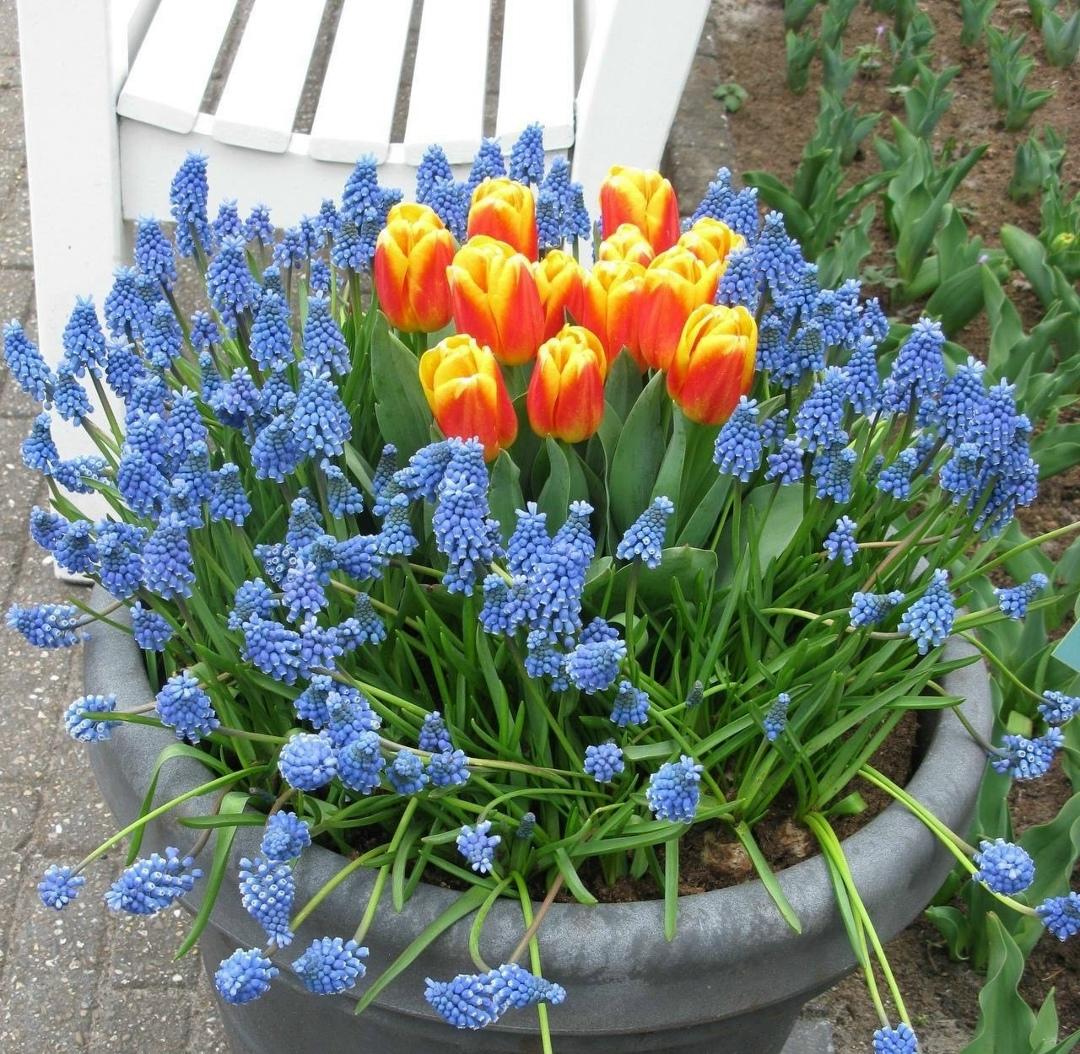 Очень красивое сочетание Мускари и Тюльпанов 🌷